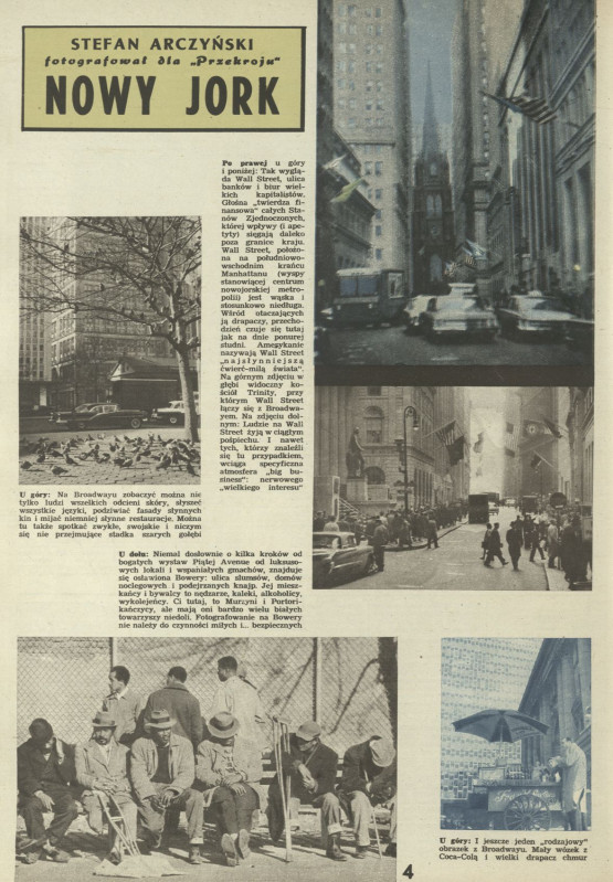 Archiwum / Fotoreportaż nr 847 (27/1961) 35101/123969 Podziel się Tytuł Nowy Jork Autor Stefan Arczyński Kategoria Fotoreportaż Artykuł z numeru 847 (27/1961) Data wydania 2 lipca 1961 Tagi USA