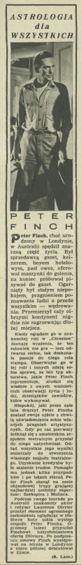 Archiwum / Astrologia dla wszystkich nr 774 (06/1960) 2/6 Podziel się Tytuł Peter Finch Autor Ryszard Lassota Rubryka Astrologia dla wszystkich Artykuł z numeru 774 (6/1960) Data wydania 7 lutego 1960 Tagi aktor gwiazdy filmowe kino