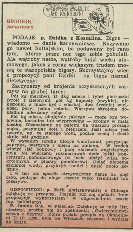 Archiwum / Jedno danie nr 1137 (04/1967) 155/2033 Podziel się Tytuł Bigosik jarzynowy Autor Jan Kalkowski Rubryka Jedno danie Artykuł z numeru 1137 (4/1967) Data wydania 22 stycznia 1967 Tagi gastronomia kulinaria przepis kulinarny mięso