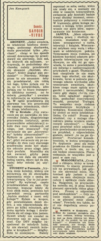 Archiwum / Demokratyczny savoir-vivre nr 1169 (36/1967) 48761/123969 Podziel się Tytuł Demokratyczny savoir vivre w odcinkach Autor Jan Kamyczek Rubryka Demokratyczny savoir-vivre Artykuł z numeru 1169 (36/1967) Data wydania 4 września 1967 Tagi savoir-vivre różności odpowiedzi na pytania czytelników