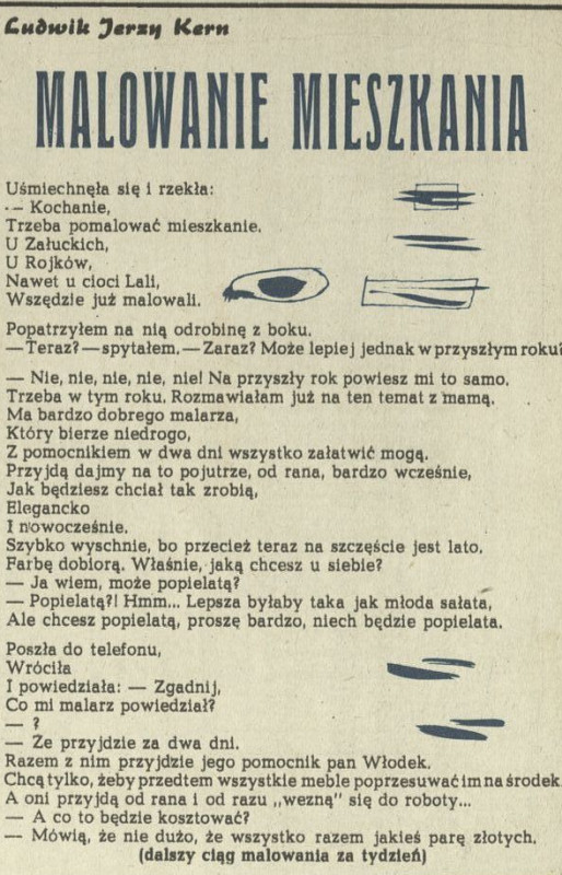 Archiwum / Poezja nr 847 (27/1961) 1/5 Podziel się Tytuł Malowanie mieszkania Autor Ludwik Jerzy Kern Kategoria Poezja Artykuł z numeru 847 (27/1961) Data wydania 2 lipca 1961 Tagi wiersz