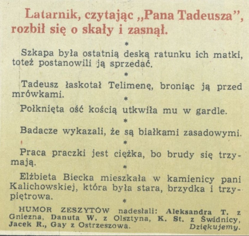 Archiwum / Humor zeszytów szkolnych nr 1424 (30/1972) 15/37 Podziel się Tytuł [Latarnik, czytając „Pana Tadeusza”...] Rubryka Humor zeszytów szkolnych Artykuł z numeru 1424 (30/1972) Data wydania 22 lipca 1972 Tagi humor zeszytów szkolnych rozmaitości