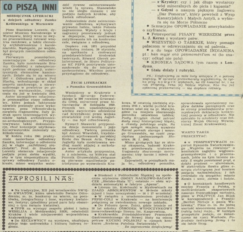 Archiwum / Co piszą inni nr 1425 (31/1972) 11/25 Podziel się Tytuł Co piszą inni Rubryka Co piszą inni Artykuł z numeru 1425 (31/1972) Data wydania 30 lipca 1972 Tagi dzieje odbudowy Zamku Królewskiego w Warszawie Pomnik Grunwaldzki w Krakowie