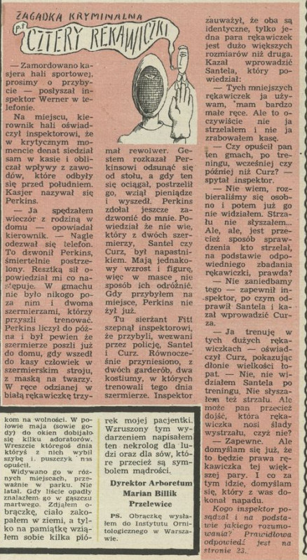 Archiwum / Zagadka kryminalna nr 822 (02/1961) 408/460 Podziel się Tytuł Cztery rękawiczki Rubryka Zagadka kryminalna Artykuł z numeru 822 (2/1961) Data wydania 8 stycznia 1961 Tagi zagadka zgadywanka łamigłówka zagadka kryminalna kryminał