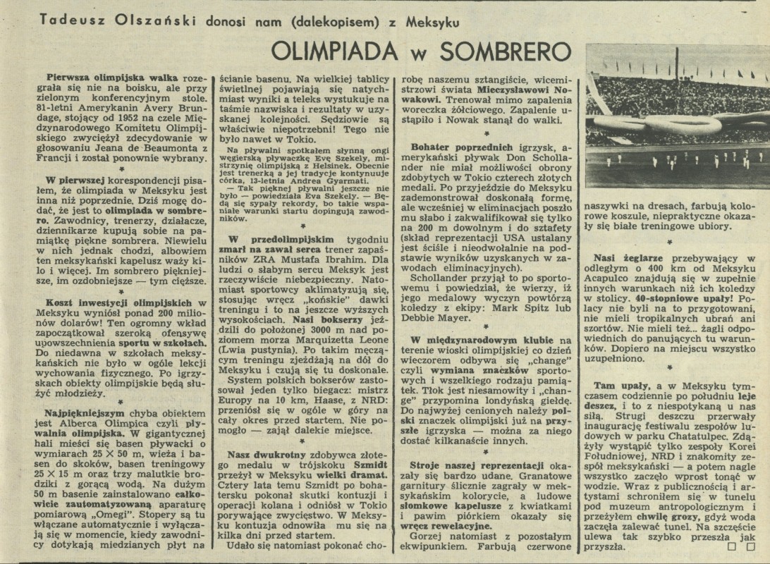 Archiwum / korespondencja własna "Przekroju" nr 1228 (42/1968) 101/116 Podziel się Tytuł Olimpiada w sombrero Autor Tadeusz Olszański Rubryka korespondencja własna "Przekroju" Artykuł z numeru 1228 (42/1968) Data wydania 20 października 1968