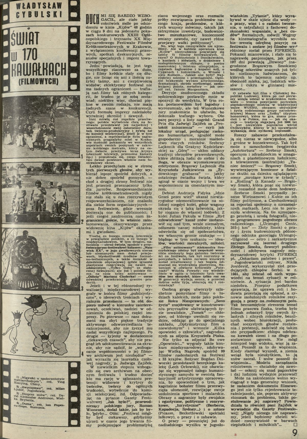 Archiwum / Felieton nr 1984 (25/1983) 69/285 Podziel się Tytuł Świat w 170 kawałkach Autor Władysław Cybulski Kategoria Felieton Artykuł z numeru 1984 (25/1983) Data wydania 19 czerwca 1983 Tagi Wladysław Cybulski XX Międzynarodowy Festiwal Filmów Międzynarodowych