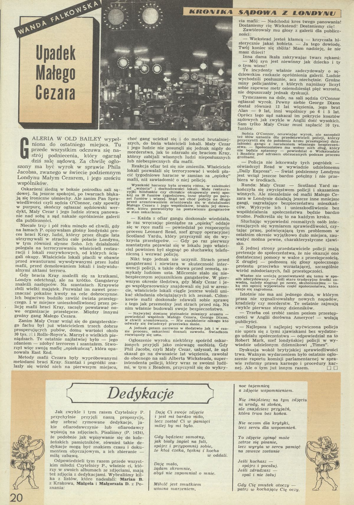 Archiwum / Kronika sądowa nr 1426 (32/1972) 33/61 Podziel się Tytuł Kronika sądowa z Londynu: upadek Małego Cezara Autor Wanda Falkowska Rubryka Kronika sądowa Artykuł z numeru 1426 (32/1972) Data wydania 6 sierpnia 1972 Tagi mafia rozprawa pogróżki szantaż bicie