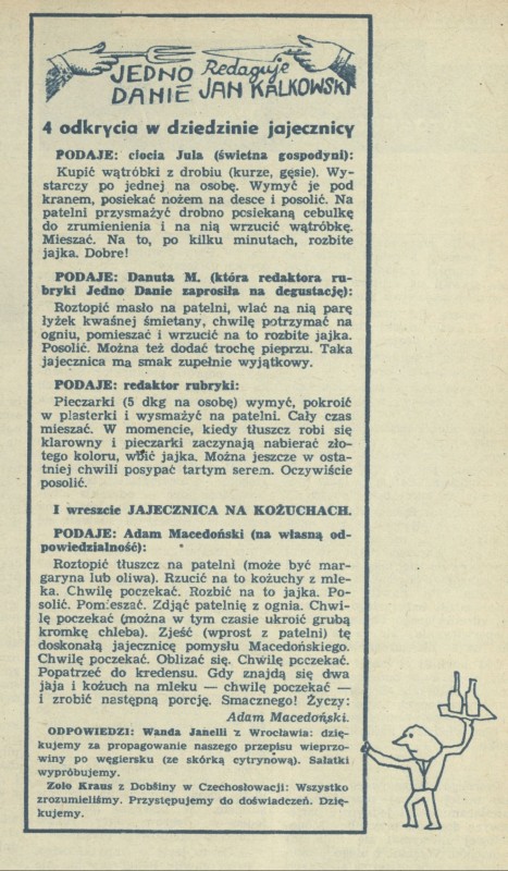 Archiwum / Jedno danie nr 884 (11/1962) 05/21 Podziel się Tytuł Jajecznica Autor Jan Kalkowski Rubryka Jedno danie Artykuł z numeru 884 (11/1962) Data wydania 18 marca 1962 Tagi gastronomia kulinaria przepis kulinarny jajka