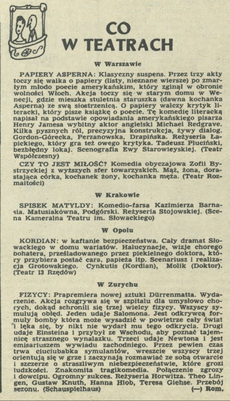 Archiwum / Teatr nr 884 (11/1962) 640/1291 Podziel się Tytuł Co w teatrach Rubryka Teatr Artykuł z numeru 884 (11/1962) Data wydania 18 marca 1962