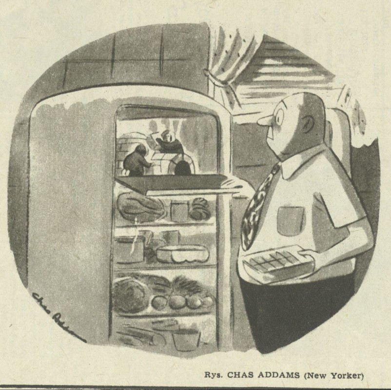Archiwum / Rysunki z magazynu The New Yorker nr 760 (44/1959) 13/13 Podziel się Tytuł Lodówka Autor Chas Addams Rubryka Rysunki z magazynu The New Yorker Artykuł z numeru 760 (44/1959) Data wydania 1 listopada 1959 Tagi żart rysunkowy humor amerykański iglo Eskimosi