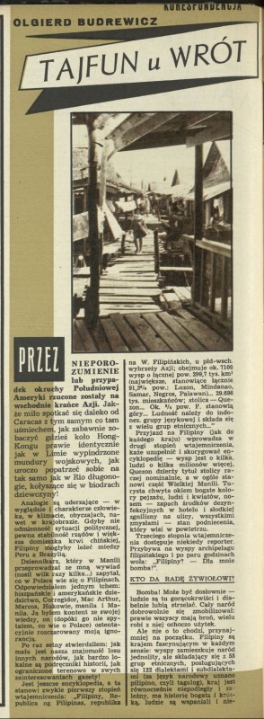Archiwum / korespondencja własna "Przekroju" nr 1170 (37/1967) 07/35 Podziel się Tytuł Tajfun u wrót Manilii Autor Olgierd Budrewicz Rubryka korespondencja własna "Przekroju" Artykuł z numeru 1170 (37/1967) Data wydania 10 września 1967 Tagi żywioł tajfun