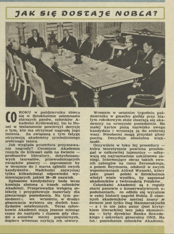 Archiwum / Artykuł nr 761 (45/1959) 158/166 Podziel się Tytuł Jak się dostaje Nobla Kategoria Artykuł Artykuł z numeru 761 (45/1959) Data wydania 8 listopada 1959 Tagi Nagroda Nobla