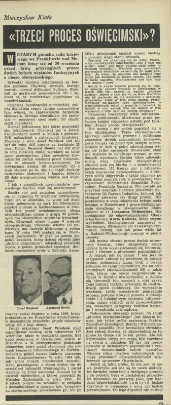 Archiwum / Artykuł nr 1176 (43/1967) 21/82 Podziel się Tytuł Trzeci proces oświęcimski? Autor Mieczysław Kieta Kategoria Artykuł Artykuł z numeru 1176 (43/1967) Data wydania 22 października 1967 Tagi obóz oświęcim