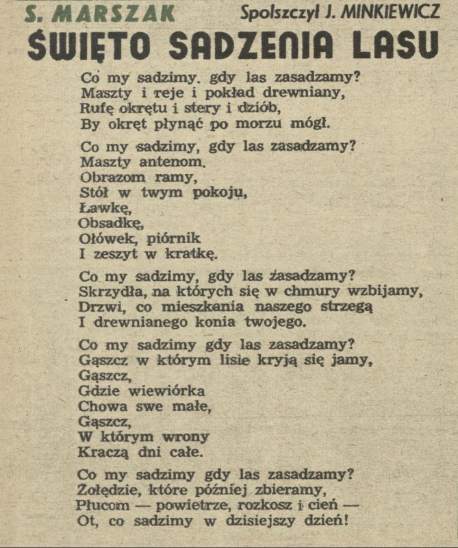 Archiwum / Poezja nr 268 (22/1950) 57/1201 Podziel się Tytuł Święto sadzenia lasu Autor Samuił Marszak Janusz Minkiewicz Kategoria Poezja Artykuł z numeru 268 (22/1950) Data wydania 28 maja 1950 Tagi wiersz