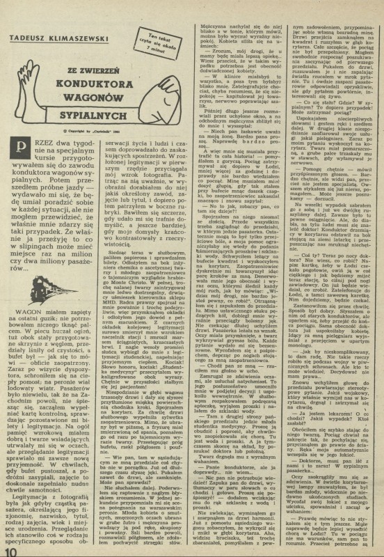 Archiwum / Reportaż nr 826 (06/1961) 222/2140 Podziel się Tytuł Ze zwierzeń konduktora wagonów sypialnych Autor Tadeusz Klimaszewski Kategoria Reportaż Artykuł z numeru 826 (6/1961) Data wydania 5 lutego 1961