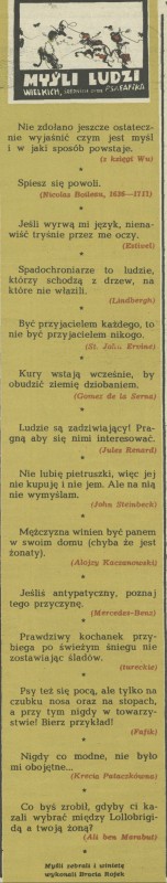 Archiwum / Myśli nr 826 (06/1961) 34127/123969 Podziel się Tytuł Myśli ludzi wielkich, średnich i psa Fafika Autor Bracia Rojek Rubryka Myśli Artykuł z numeru 826 (6/1961) Data wydania 5 lutego 1961