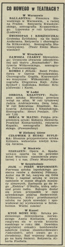 Archiwum / Teatr nr 826 (06/1961) 34136/123969 Podziel się Tytuł Co? w teatrach Rubryka Teatr Artykuł z numeru 826 (6/1961) Data wydania 5 lutego 1961 Tagi Balladyna Zawisza Czarny Romeo i Julia
