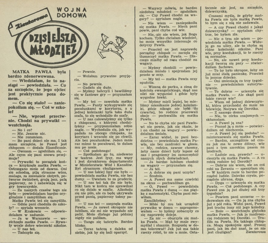 Archiwum / Wojna domowa nr 891 (18/1962) 08/21 Podziel się Tytuł Dzisiejsza młodzież Autor Maria Zientarowa Rubryka Wojna domowa Artykuł z numeru 891 (18/1962) Data wydania 6 maja 1962 Tagi prywatka