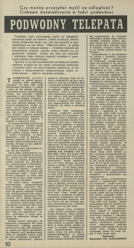 Archiwum / Artykuł nr 785 (17/1960) 13/13 Podziel się Tytuł Podwodny telepata Autor Mieczysław Lis-Gawalewicz Kategoria Artykuł Artykuł z numeru 785 (17/1960) Data wydania 24 kwietnia 1960 Tagi telepatia Gertruda Schmeidler