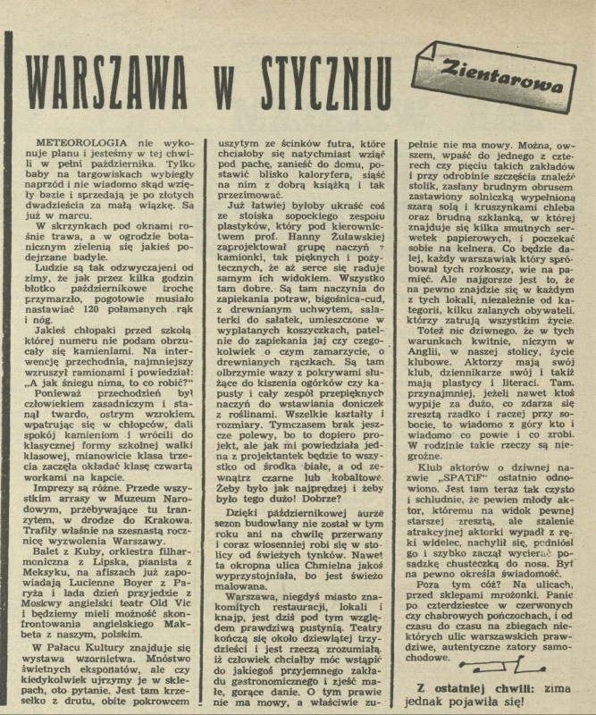 Archiwum / Różności nr 825 (05/1961) 03/32 Podziel się Tytuł Warszawa w styczniu Autor Maria Zientarowa Kategoria Różności Artykuł z numeru 825 (5/1961) Data wydania 29 stycznia 1961