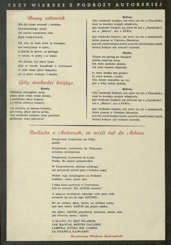 Archiwum / Poezja nr 270 (24/1950) 367/3955 Podziel się Tytuł Trzy wiersze z podróży autorskiej: Nowy Człowiek, Gdy wschodzi księżyc, Ballada o Autorach, co mieli żal do Atosu Autor Konstanty Ildefons Gałczyński Kategoria Poezja Artykuł z numeru 270 (24/1950) Data wydania 11 czerwca 1950