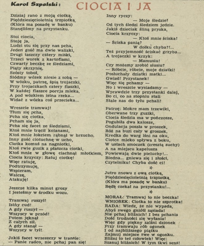 Archiwum / Rozmaitości [old] nr 270 (24/1950) 55/711 Podziel się Tytuł Ciocia i ja Autor Karol Szpalski Rubryka Rozmaitości [old] Artykuł z numeru 270 (24/1950) Data wydania 11 czerwca 1950 Tagi wiersz