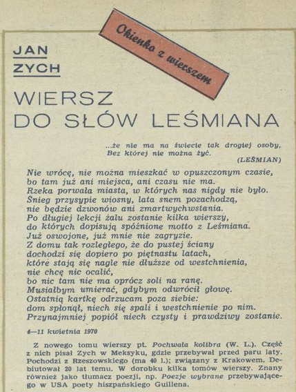 Archiwum / Okienko z wierszem nr 1431 (37/1972) 58432/123969 Podziel się Tytuł Wiersz do słów Leśmiana Autor Jan Zych Rubryka Okienko z wierszem Artykuł z numeru 1431 (37/1972) Data wydania 10 września 1972 Tagi Jan Zych wiersz Bolesław Leśmian