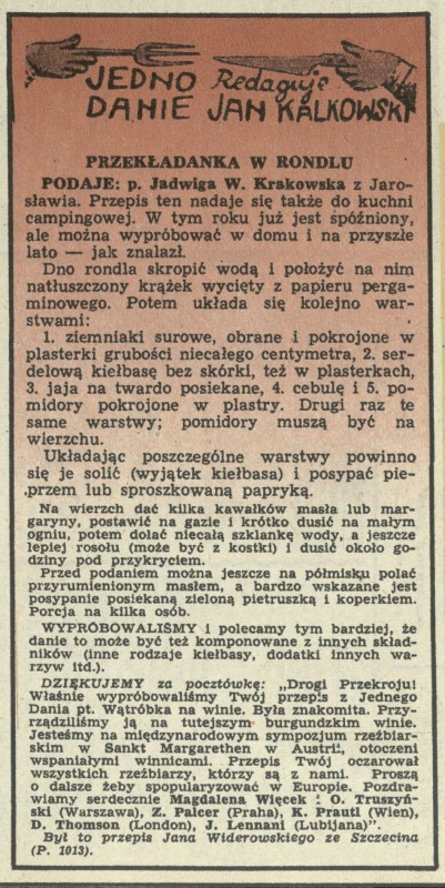 Archiwum / Jedno danie nr 1018 (41/1964) 712/923 Podziel się Tytuł Przekładanka w rondlu Autor Jan Kalkowski Rubryka Jedno danie Artykuł z numeru 1018 (41/1964) Data wydania 11 października 1964 Tagi gastronomia kulinaria przepis kulinarny ziemniaki kiełbasa wątróbka