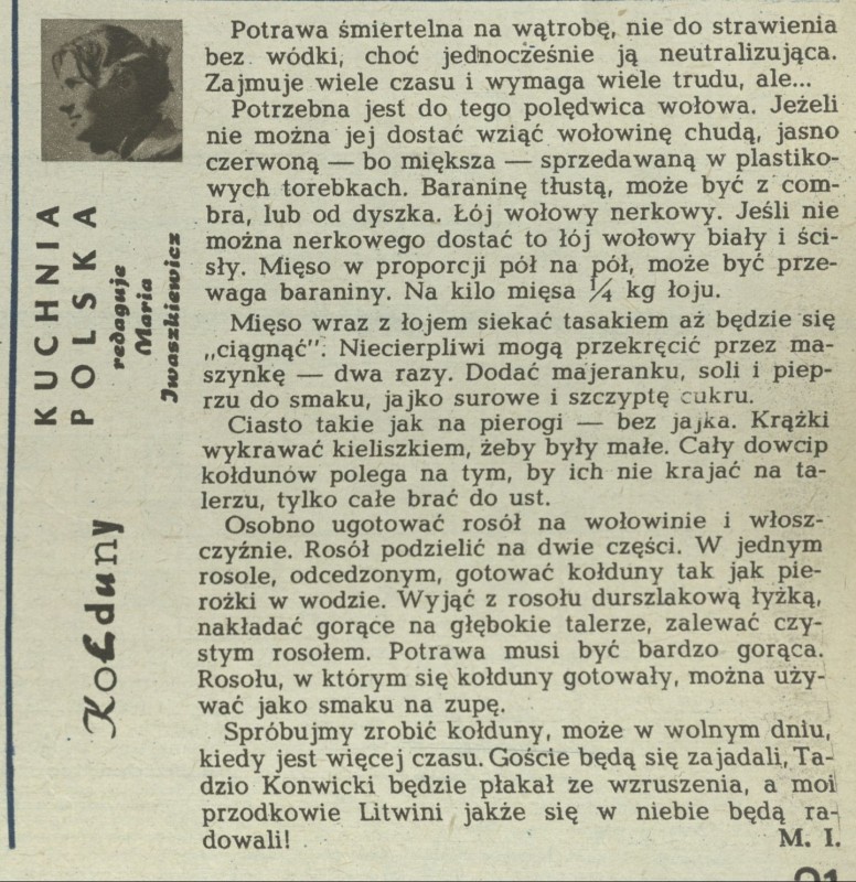 Archiwum / Kuchnia Polska nr 878 (05/1962) 36638/123969 Podziel się Tytuł Kuchnia polska Autor Maria Iwaszkiewicz Rubryka Kuchnia Polska Artykuł z numeru 878 (5/1962) Data wydania 4 lutego 1962