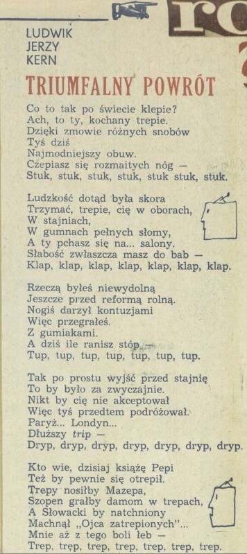 Archiwum / Rozmaitości [old] nr 1431 (37/1972) 60/90 Podziel się Tytuł Triumfalny powrót Autor Ludwik Jerzy Kern Rubryka Rozmaitości [old] Artykuł z numeru 1431 (37/1972) Data wydania 10 września 1972 Tagi Ludwik Jerzy Kern wiersz rozmaitości