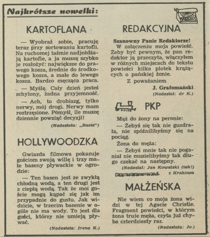 Archiwum / Najkrótsze nowelki nr 789 (21/1960) 32433/123969 Podziel się Tytuł Najkrótsze nowelki Rubryka Najkrótsze nowelki Artykuł z numeru 789 (21/1960) Data wydania 22 maja 1960