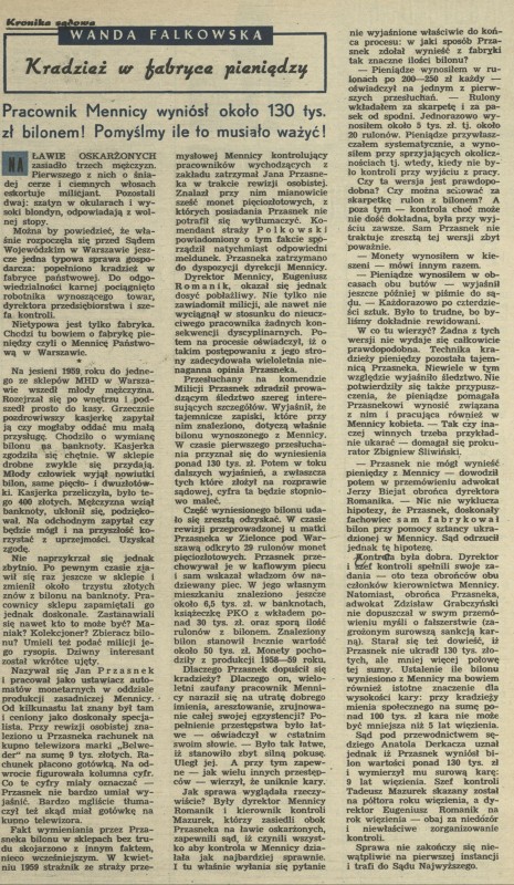 Archiwum / Kronika sądowa nr 795 (27/1960) 108/330 Podziel się Tytuł Kradzież w fabryce pieniędzy Autor Wanda Falkowska Rubryka Kronika sądowa Artykuł z numeru 795 (27/1960) Data wydania 3 lipca 1960 Tagi prawo