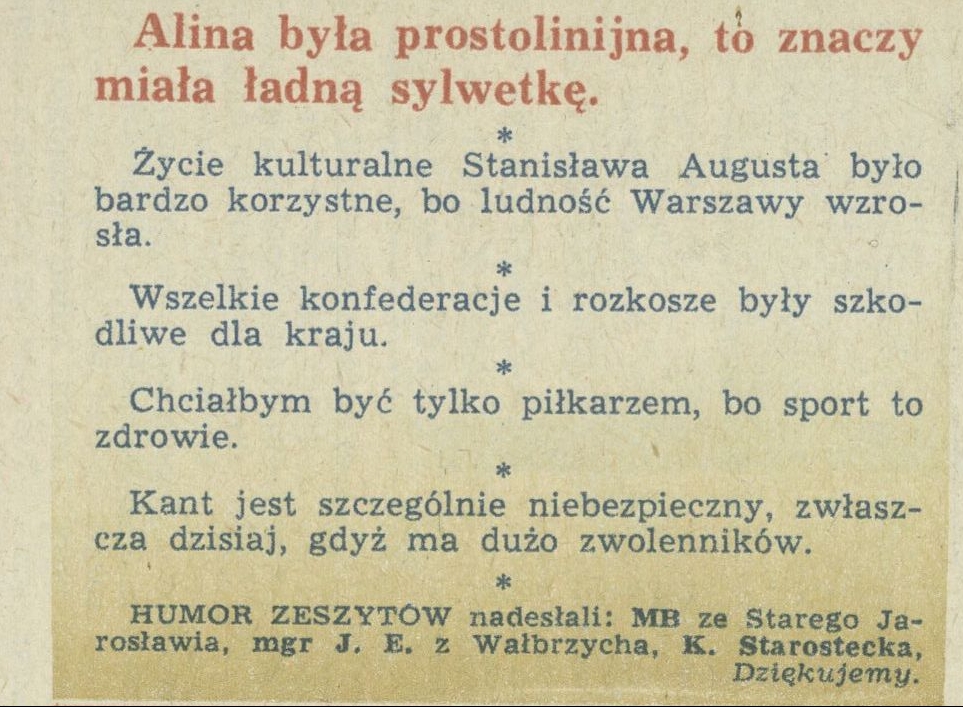 Archiwum / Humor zeszytów szkolnych nr 1432 (38/1972) 20/46 Podziel się Tytuł [Alina była prostolinijna...] Rubryka Humor zeszytów szkolnych Artykuł z numeru 1432 (38/1972) Data wydania 17 września 1972 Tagi humor zeszytów szkolnych rozmaitości