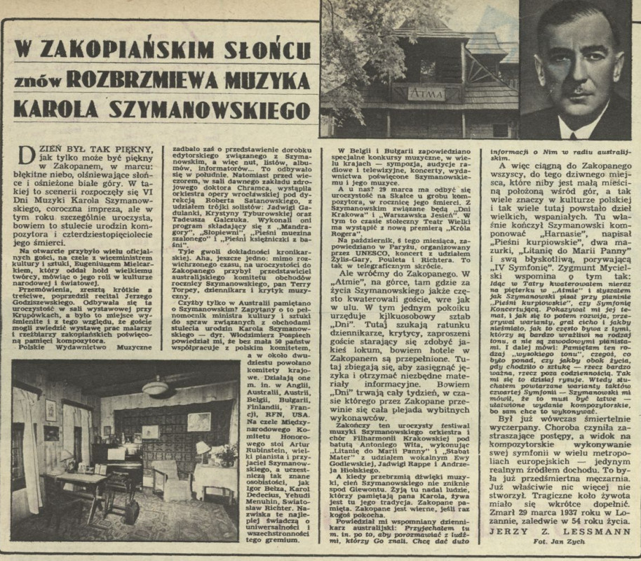 Archiwum / Artykuł nr 1918 (04/1982) 78952/123969 Podziel się Tytuł W zakopiańskim słońcu znów rozbrzmiewa muzyka Karola Szymanowskiego Autor Jerzy Z. Lessman Kategoria Artykuł Artykuł z numeru 1918 (4/1982) Data wydania 14 marca 1982 Tagi Karol Szymanowski Zakopane