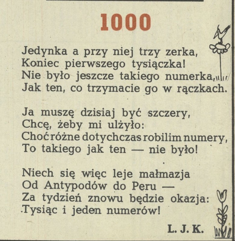Archiwum / Poezja nr 1000 (23/1964) 693/2283 Podziel się Tytuł 1000 Autor Ludwik Jerzy Kern Kategoria Poezja Artykuł z numeru 1000 (23/1964) Data wydania 7 czerwca 1964