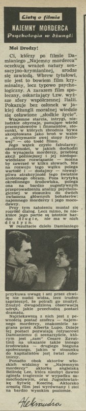 Archiwum / Listy o filmie nr 905 (32/1962) 185/592 Podziel się Tytuł „Najemny morderca” psychologia w dżungli Autor Aleksandra Rubryka Listy o filmie Artykuł z numeru 905 (32/1962) Data wydania 12 sierpnia 1962 Tagi kinematografia włoska dramat Damiani