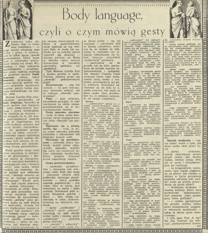 Archiwum / Artykuł nr 1887 (23/1981) 77732/123969 Podziel się Tytuł Body language, czyli o czym mówią gesty Autor et Kategoria Artykuł Artykuł z numeru 1887 (23/1981) Data wydania 7 czerwca 1981 Tagi mowa ciała psychologia