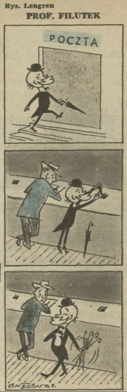 Archiwum / Profesor Filutek nr 273 (27/1950) 193/2446 Podziel się Tytuł Prof. Filutek Autor Zbigniew Lengren Rubryka Profesor Filutek Artykuł z numeru 273 (27/1950) Data wydania 2 lipca 1950 Tagi żart rysunkowy poczta