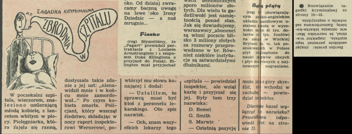 Archiwum / Zagadka kryminalna nr 793 (25/1960) 433/460 Podziel się Tytuł Zbrodnia w szpitalu Rubryka Zagadka kryminalna Artykuł z numeru 793 (25/1960) Data wydania 19 czerwca 1960