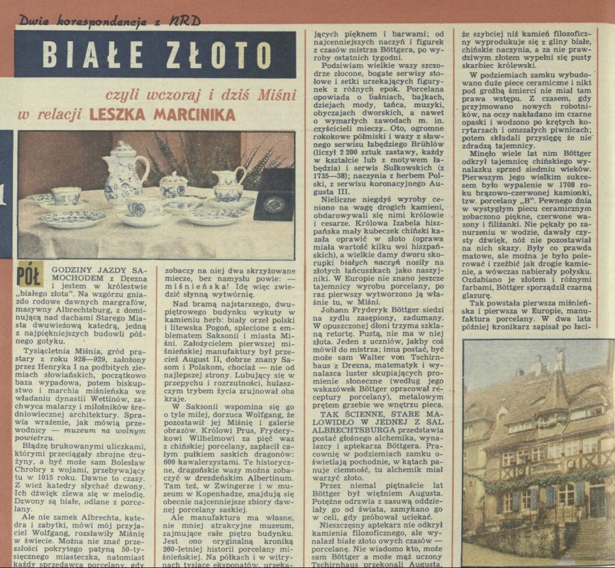 Archiwum / Korespondencja nr 1437 (43/1972) 58759/123969 Podziel się Tytuł Białe złoto, czyli wczoraj i dziś Miśni Autor Leszek Marcinik Kategoria Korespondencja Artykuł z numeru 1437 (43/1972) Data wydania 22 października 1972 Tagi Miśnia wytwórnia porcelany NRD
