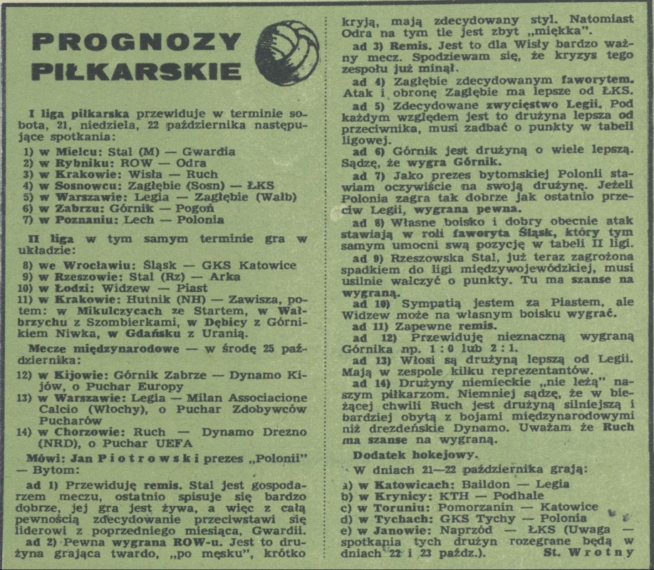 Archiwum / Piłkarskie prognozy nr 1437 (43/1972) 19/78 Podziel się Tytuł Prognozy piłkarskie Autor Stanisław Wrotny Rubryka Piłkarskie prognozy Artykuł z numeru 1437 (43/1972) Data wydania 22 października 1972 Tagi piłka nożna prognozy mecze