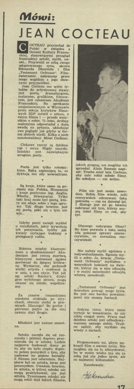 Archiwum / Kultura nr 812 (44/1960) 33522/123969 Podziel się Tytuł Mówi: Jean Cocteau Autor Aleksandra Kategoria Kultura Artykuł z numeru 812 (44/1960) Data wydania 30 października 1960