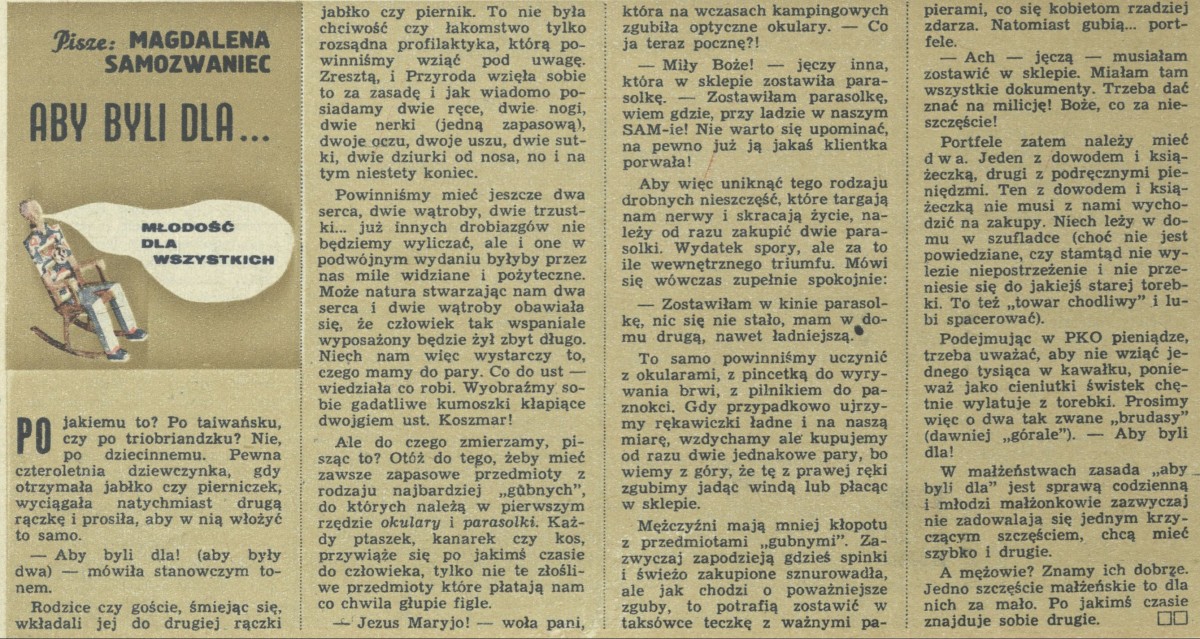 Archiwum / Felieton nr 1438 (44/1972) 58850/123969 Podziel się Tytuł Aby byli dla... Autor Magdalena Samozwaniec Kategoria Felieton Artykuł z numeru 1438 (44/1972) Data wydania 29 października 1972 Tagi młodość starość rady wskazówki