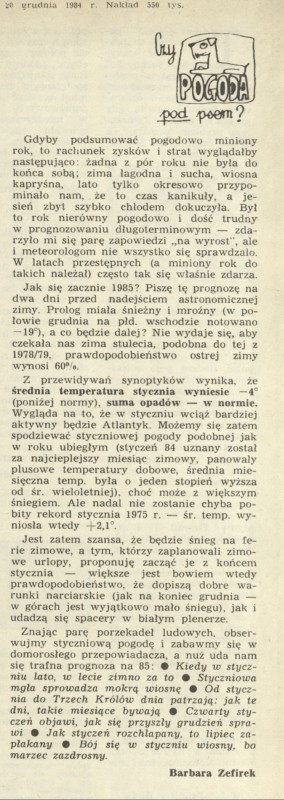 Archiwum / Czy pogoda pod psem? nr 2065 (01/1985) 84788/123969 Podziel się Tytuł Czy pogoda pod psem? Autor Barbara Zefirek Rubryka Czy pogoda pod psem? Artykuł z numeru 2065 (1/1985) Data wydania 6 stycznia 1985 Tagi pogoda styczeń