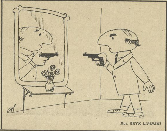 Archiwum / Rozmaitości nr 769 (01/1960) 02/17 Podziel się Tytuł W lustrze Autor Eryk Lipiński Rubryka Rozmaitości Artykuł z numeru 769 (1/1960) Data wydania 3 stycznia 1960 Tagi żart rysunkowy pistolet broń