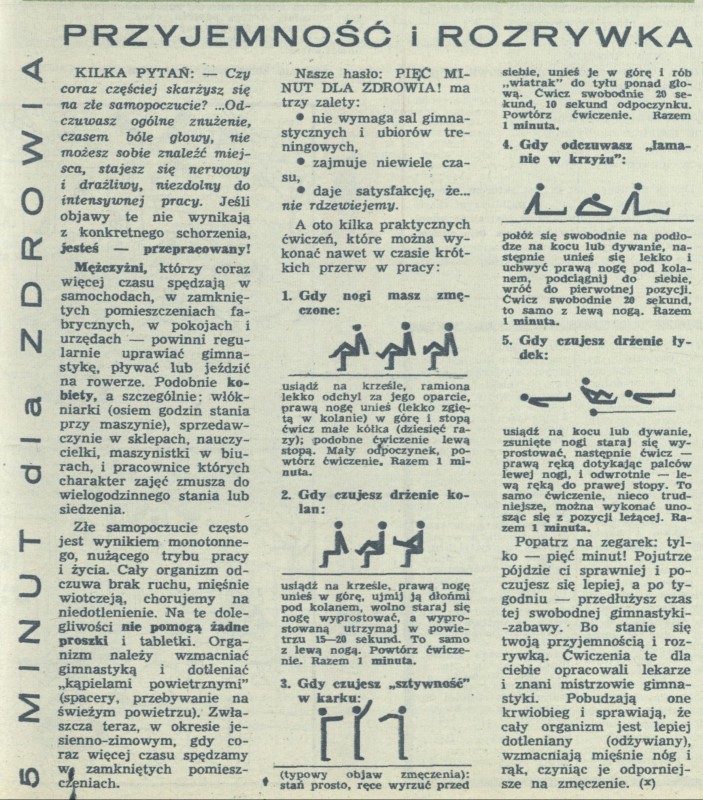 Archiwum / Różności nr 1439 (45/1972) 09/100 Podziel się Tytuł 5 minut dla zdrowia. Przyjemność i rozrywka Autor x Kategoria Różności Artykuł z numeru 1439 (45/1972) Data wydania 5 listopada 1972 Tagi gimnastyka zdrowie