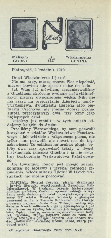 Archiwum / Różności nr 1439 (45/1972) 58900/123969 Podziel się Tytuł Listy Maksyma Gorkiego do Włodzimierza Lenina (fragmenty) Kategoria Różności Artykuł z numeru 1439 (45/1972) Data wydania 5 listopada 1972 Tagi Włodzimierz Lenin Maksym Gorki listy