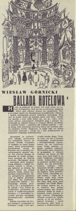 Archiwum / Felieton nr 1676 (21/1977) 02/12 Podziel się Tytuł Ballada hotelowa Autor Wiesław Górnicki Kategoria Felieton Artykuł z numeru 1676 (21/1977) Data wydania 26 maja 1977