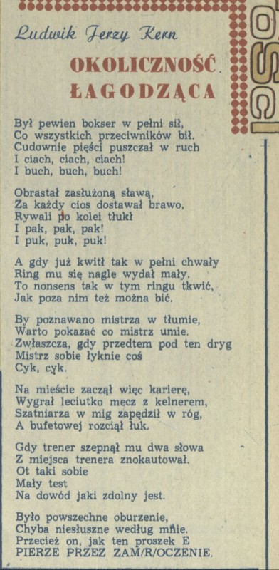 Archiwum / Poezja nr 1565 (14/1975) 66026/123969 Podziel się Tytuł Okoliczność łagodząca Autor Ludwik Jerzy Kern Kategoria Poezja Artykuł z numeru 1565 (14/1975) Data wydania 6 kwietnia 1975