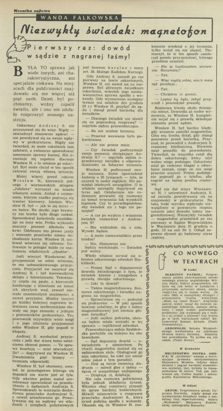 Archiwum / Kronika sądowa nr 770 (02/1960) 82/2238 Podziel się Tytuł Niezwykły świadek: magnetofon Autor Wanda Falkowska Rubryka Kronika sądowa Artykuł z numeru 770 (2/1960) Data wydania 10 stycznia 1960 Tagi sąd prawo